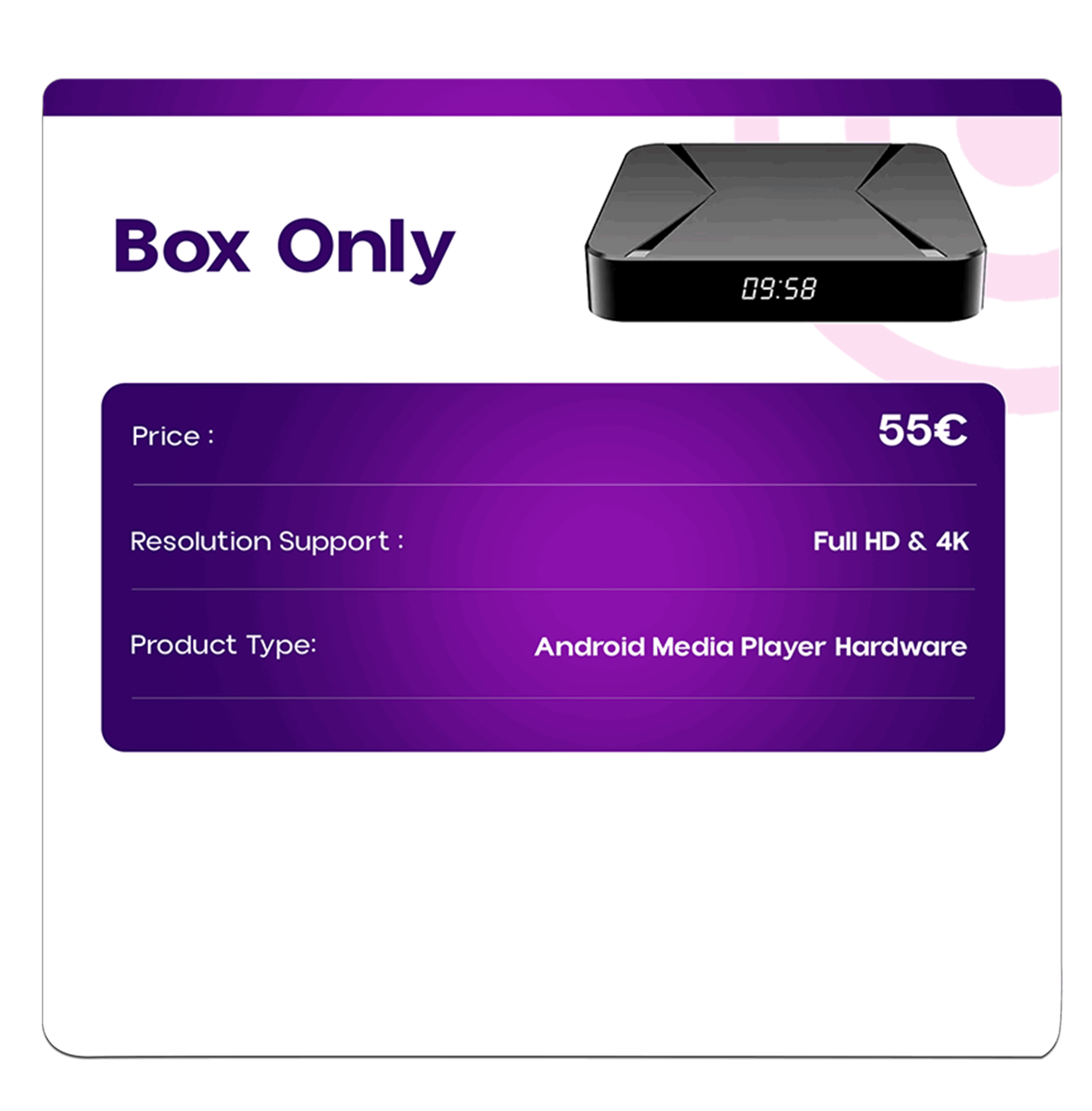The Box Only package includes a standalone Android media player device designed to upgrade any compatible TV into a smart entertainment system. This product is hardware-only and is sold without any streaming subscriptions, services, or bundled content.